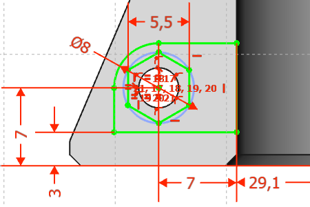 Horizontaler Abstand zum Koordinatennullpunkt 29,1 mm (=Radius der Eckenrundung)Vertikales Maß [Constraint DistanceY]