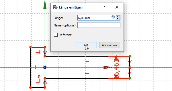 - Nach dem Bemaßen sind mir regelmäßig die Maße versprungen von der Mitte des Fadenkreuzes zum Ende einer der Linien. Vielleicht muss man genau darauf achten, welche der beiden Linein man erwischt. Besser wird es wohl sein, die kleine Mittelpunktmarkierung zu bemaßen, die TechDraw automatisch liefert.